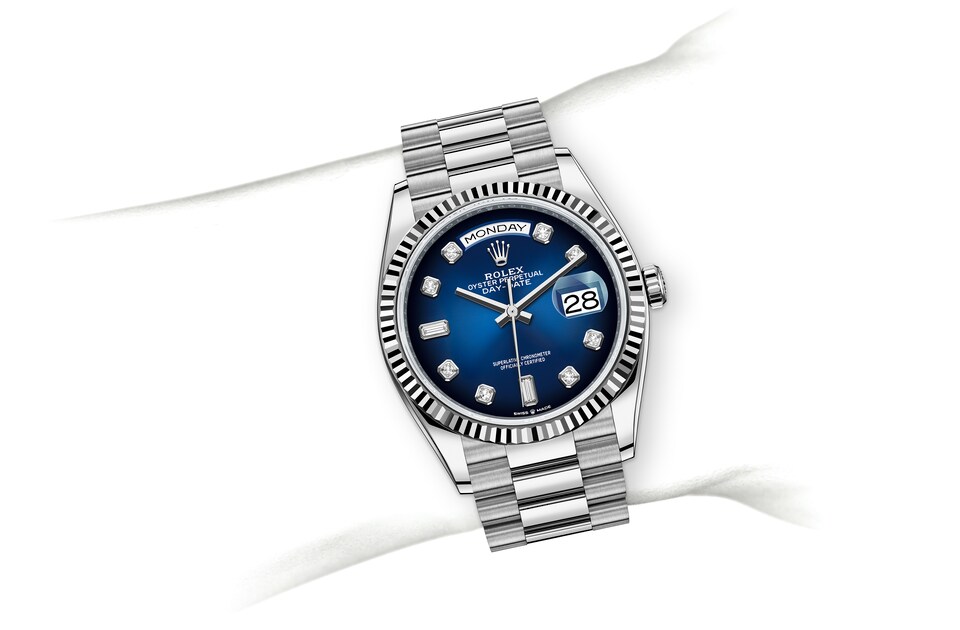 The Rolex fluted bezel is a mark of distinction. Originally, the fluting of the Oyster bezel had a functional purpose: it served to screw the bezel onto the case helping to ensure the waterproofness of the watch. It was therefore identical to the fluting on the case back, which was also screwed onto the case for waterproofness, using specific Rolex tools. Over time, the fluting became an aesthetic element, a genuine Rolex signature feature. Today the fluted bezel is a mark of distinction, in gold on this Day-Date 36.