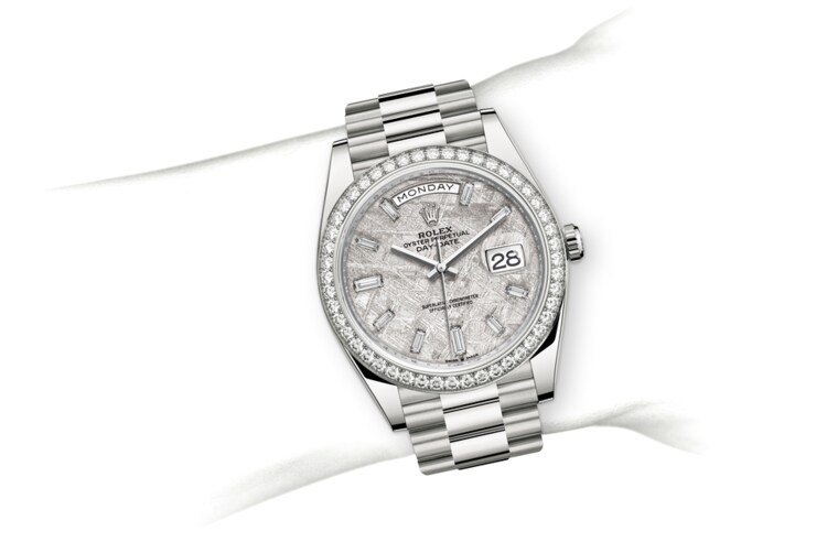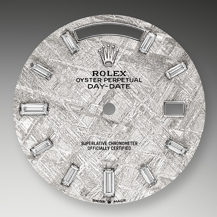 Meteorite comes from the heart of an asteroid or possibly even a planet that has exploded, propelling material across the Solar System until chance brings it into our planet’s orbit and gravity pulls it to Earth. During its journey, the centre of the meteorite is gradually transformed, producing highly unusual metallic patterns, resulting from the very slow cooling of molten asteroid cores. The designers at Rolex create from these configurations a unique treasure for some of the most prestigious models, including this Day-Date 40.