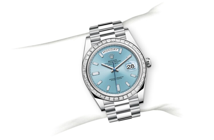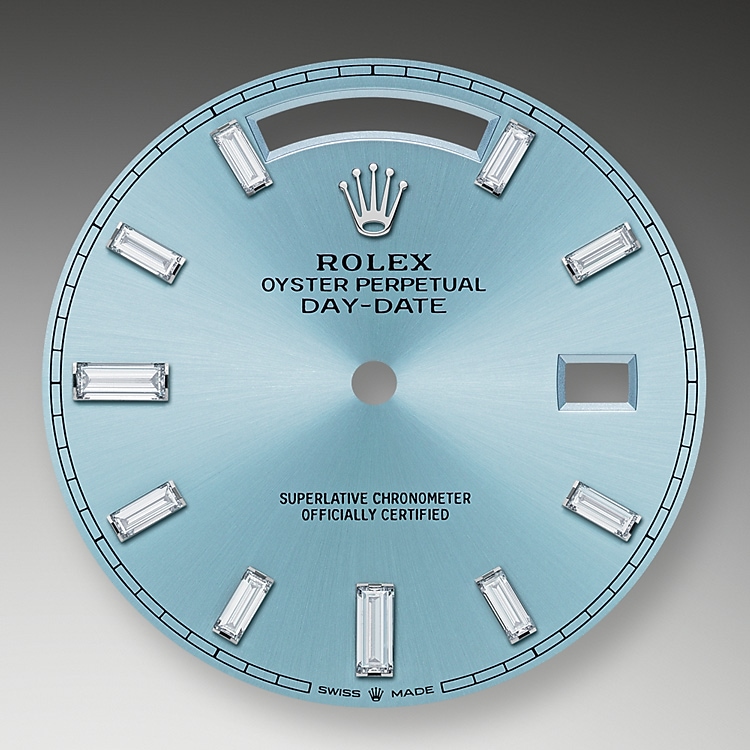 The ice-blue dial is the discreet and exclusive signature of a Rolex platinum watch. Rolex uses platinum, the noblest of metals, for the finest of watches. These exclusive dials can be found only on the Day-Date and the Cosmograph Daytona.