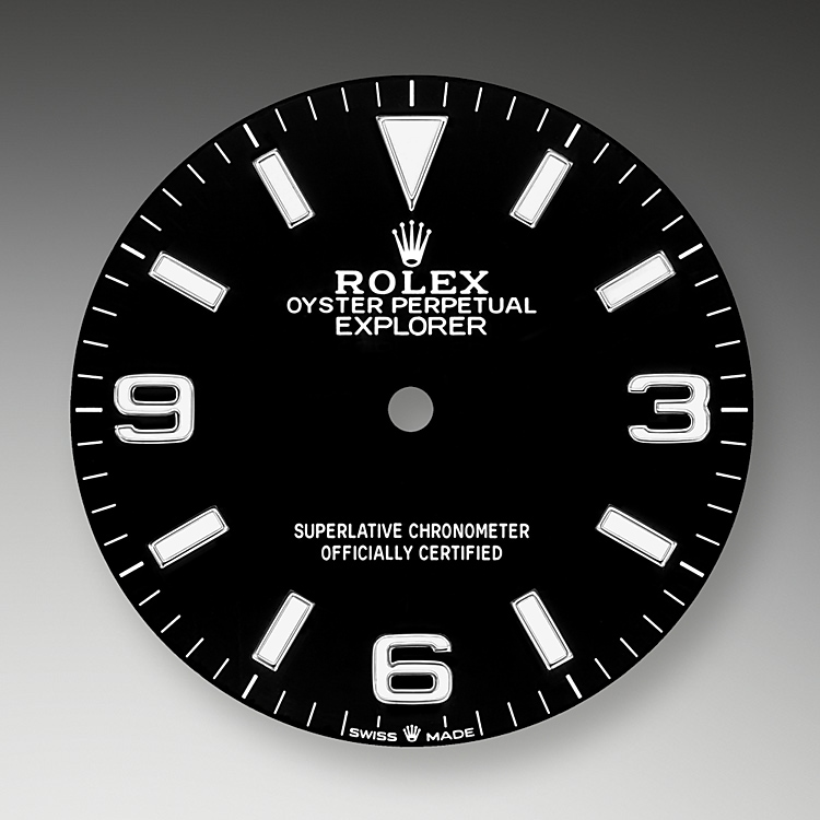 The dial is the distinctive face of a Rolex watch, the feature most responsible for its identity and readability. The latest Explorer model’s characteristic 3, 6 and 9 numerals are now filled with a luminescent material emitting a long-lasting blue glow, like the hour markers and hands. Like all Rolex timepieces, the Explorer's dial is designed and manufactured in-house, largely by hand to ensure perfection.