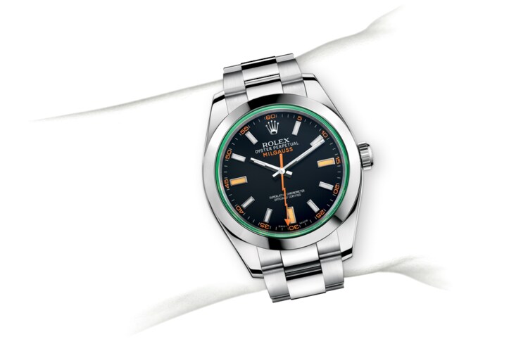 The green sapphire crystal is a unique watch crystal developed by Rolex, it is scratchproof, fade-proof and available exclusively on the Milgauss. Its light green shade, tinted throughout the entire crystal, turns nearly luminescent at the bevelled edges. The result of a secret process that required years of development to master and takes weeks to produce.