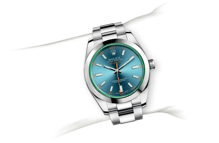The green sapphire crystal is a unique watch crystal developed by Rolex, it is scratchproof, fade-proof and available exclusively on the Milgauss. Its light green shade, tinted throughout the entire crystal, turns nearly luminescent at the bevelled edges. The result of a secret process that required years of development to master and takes weeks to produce.