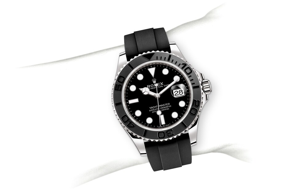 The Yacht-Master’s bidirectional rotatable 60-minute graduated bezel is made of precious materials. The raised polished numerals and graduations stand out clearly against a matt, sand-blasted background. This functional bezel – which allows the wearer to calculate, for example, the sailing time between two buoys – is also a key component in the model’s distinctive visual identity.